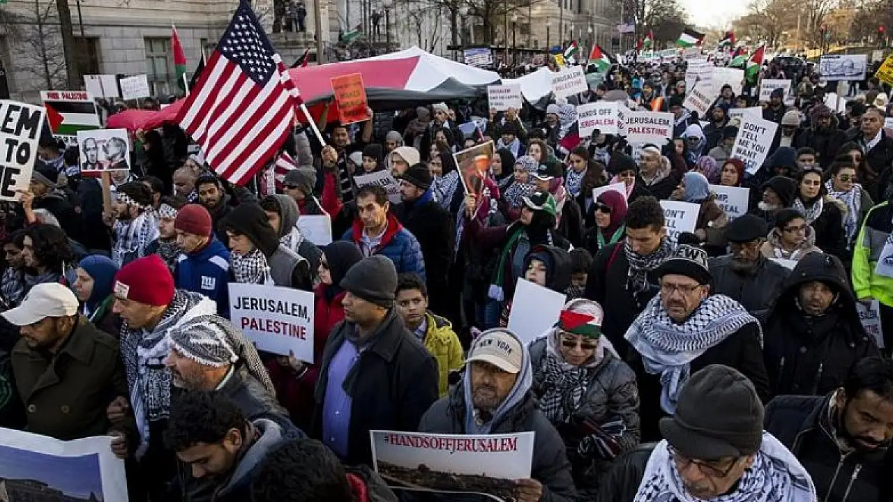 ABD'nin başkenti Washington'da toplanan binlerce gösterici, Başkan Donald Trump'ın Kudüs'ü "İsrail'in başkenti" olarak tanıma kararını protesto etti.