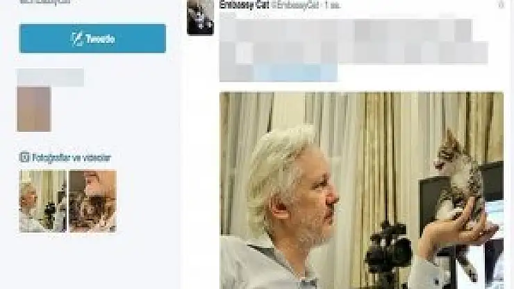 Assange'ın çocukları tarafından hediye edilen kedi için sosyal medya sitesi Twitter'da, EmbassyCat (elçilik kedisi) kullanıcı adlı bir profil oluşturuldu.