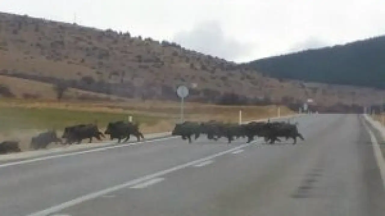 Konya'nın Hüyük ilçesinde, karayoluna çıkan yaban domuzu sürüleri sürücülerin adeta korkulu rüyası haline dönüştü.