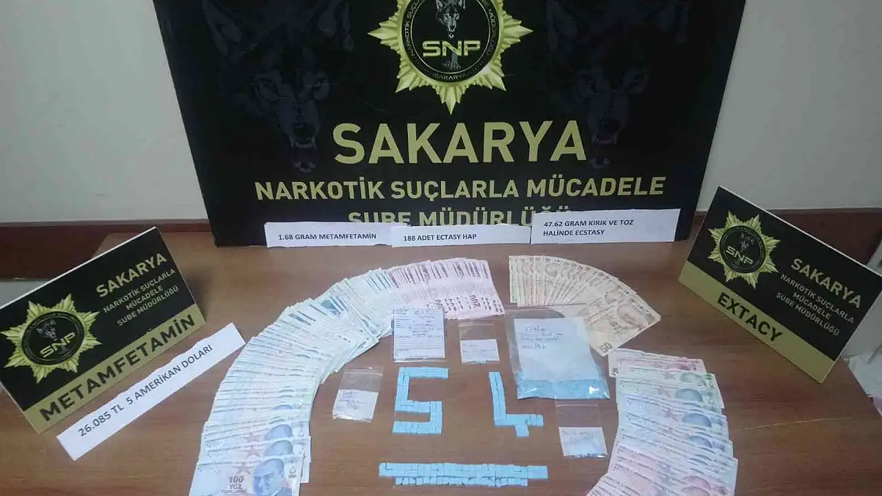 Sakarya Emniyet Müdürlüğüne bağlı ekipler şehirde suça geçit vermiyor. Bu kapsamda Narkotik Suçlarla Mücadele Şube Müdürlüğü ve İstihbarat Şube Müdürlüğü ekiplerince uyuşturucu madde ticaretini önlemeye yönelik yapılan çalışmalar kapasımda Adapazarı ilçesinde iki ayrı operasyon düzenlendi. Polisler tarafından yakalanacağını anlayan şüpheliler, uyuşturucu maddesini yola saçarak kaçmaya çalıştılar. Ekiplerce yakalanan iki araç içerisinde yapılan aramalarda; 188 adet extacy hap, 183,57 gram metamfetamin maddesi, 47,62 gram toz halinde extacy maddesi, 16,98 gram esrar maddesi, 1 adet hassas terazi ve suçtan elde edildiği değerlendirilen toplamda 26 bin 85 TL ele geçirildi.