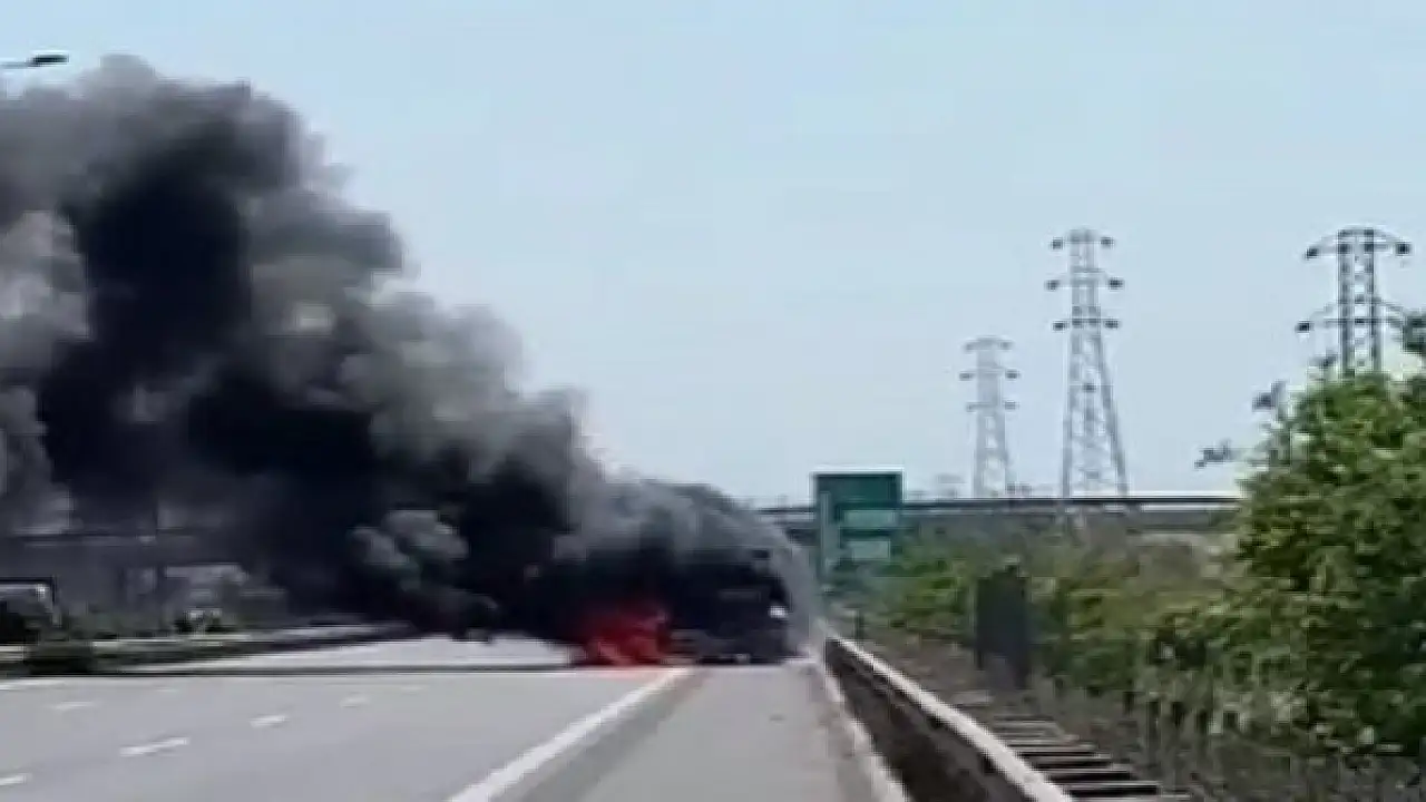 İzmir'in Menemen ilçesinde akaryakıt yüklü tanker seyir halindeyken alev aldı.