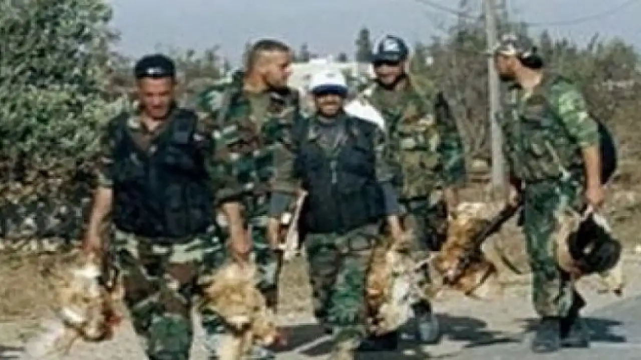 Fotoğrafta, Esed rejimine bağlı askerler, ellerinde ölü tavuklarla yürürken görülüyor.