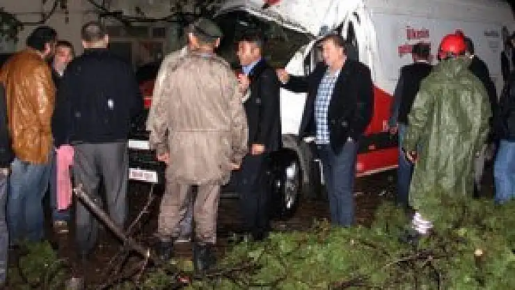 Yalova'da şiddetli yağış ve fırtına ağaçları devrildi. Çiftlikköy ilçesine bağlı Dereköy'de yaşlı bir ağaç Milliyetçi Hareket Partisi Milletvekili adaylarını taşıyan minibüsün üzerine devrildi. Şans eseri yaralanma olmazken araçta ağır hasar meydana geldi.