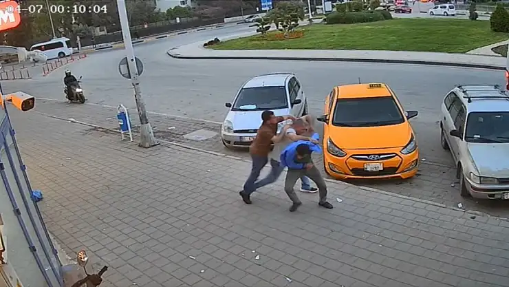 ADANA'da 2 kişi yan bakma bahanesiyle tartıştıkları kişiyi tekme ve yumrukla darbetti. Kavga, bir iş yerinin güvenlik kamerasına yansıdı.