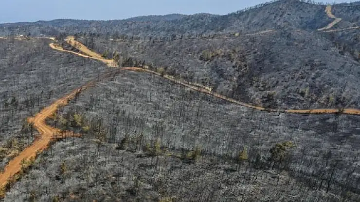 Marmaris ilçesinde çıkan orman yangınına müdahaleler havadan ve yerden sürerken zarar gören alanlar havadan görüntülendi.
