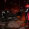 Bursa'da otoyol üzerinde bariyerlere çarpıp yanan araç, sahipsiz halde itfaiye ekipleri tarafından söndürüldü.