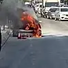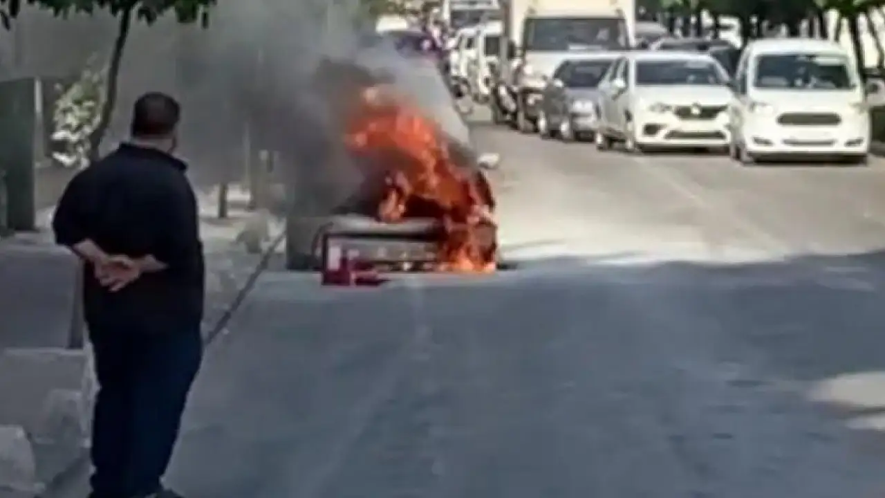 Adana'da bir otomobil caddede alev alev yanarken bir vatandaşın olanları film izler gibi izlemesi dikkat çekti.