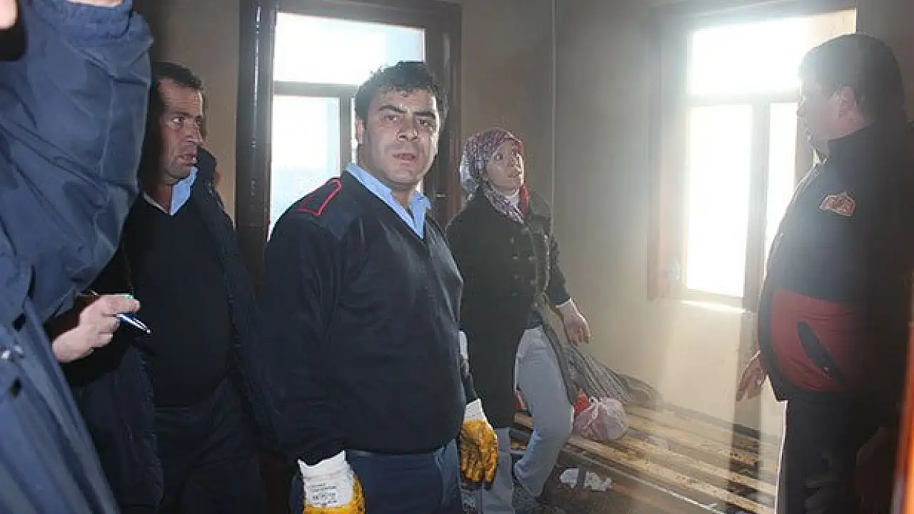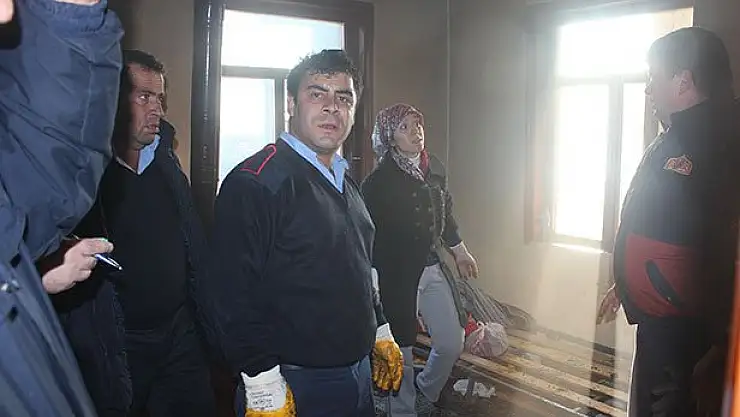 Yoğun dumanla kaplanan odaya maske takarak giren ekipler, yanan eşyaları söndürdükten sonra pencereden dışarıya attı.
