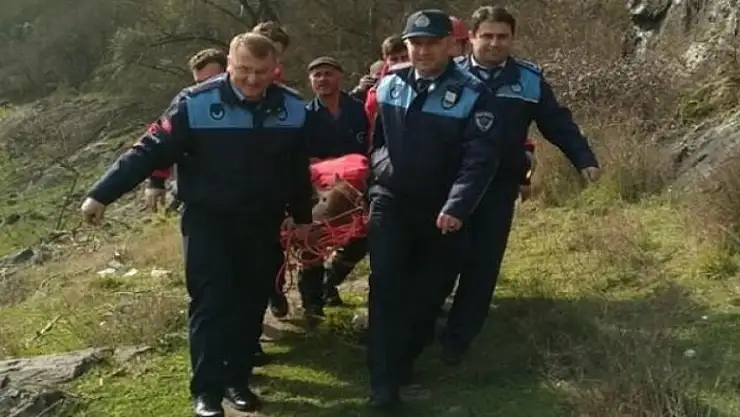 Kepez Mahallesi’nde bulunan Yaralı Barajı çevresinde otlayan dana, yaklaşık 10 metre yükseklikten yuvarlandı. Kayalıklara çarparak, duran dananın sahibi Orhan Duru, kendi imkanlarıyla hayvanı kurtaramayınca, durumu itfaiyeye haber verdi.