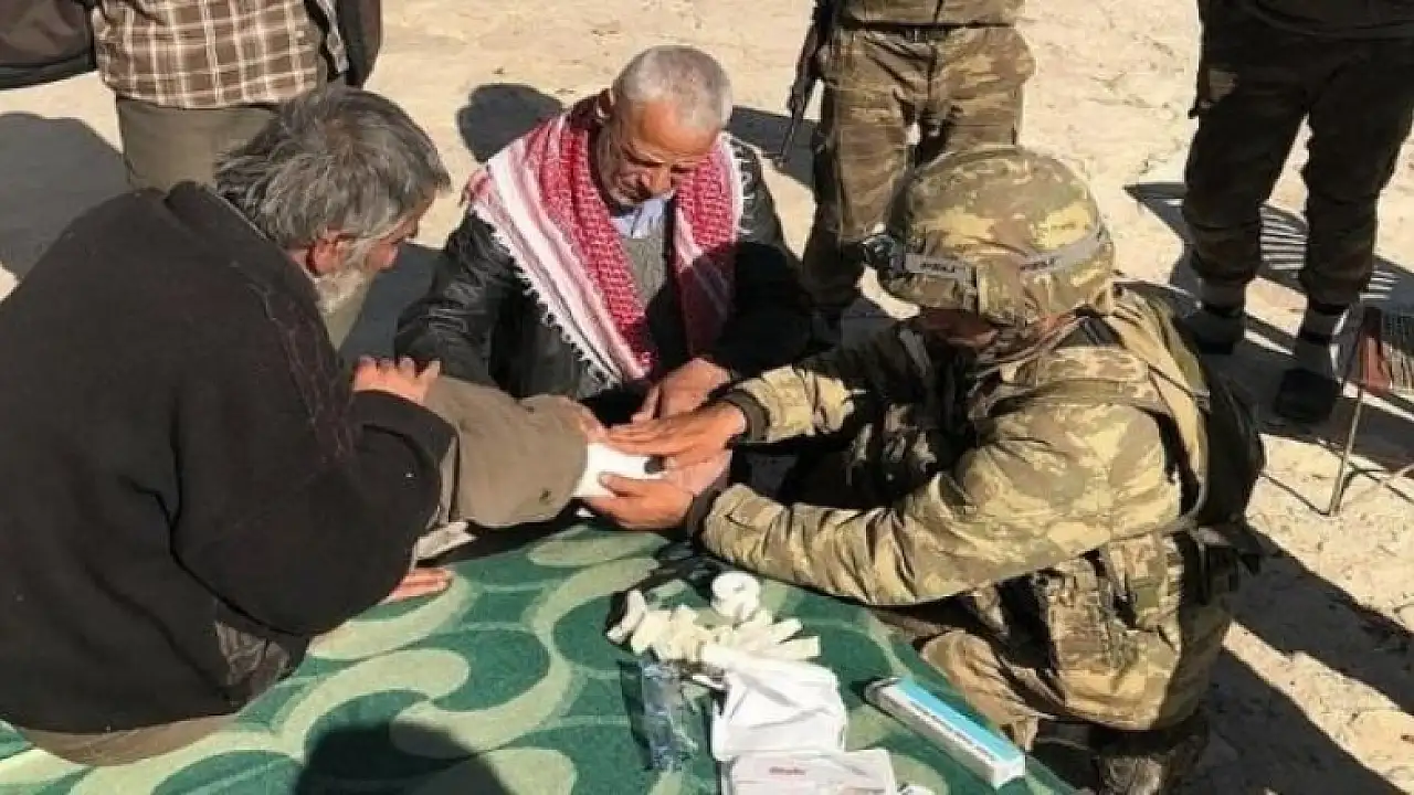 Bir sıhhiye personeli de köyde daha önce bacağından yaralanan bir yaşlıya tıbbi müdahalede bulundu.