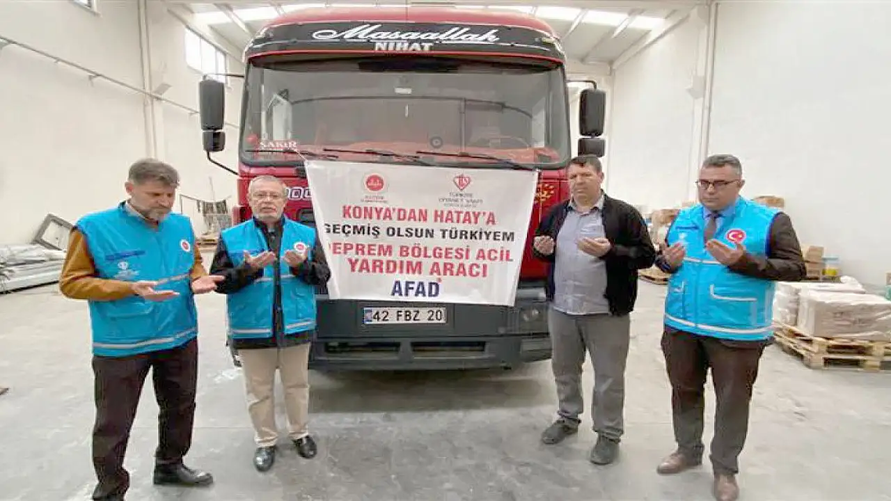Konya'dan 29. destek ekibi ile gıda ve temizlik malzemesinden oluşan yardım tırı deprem bölgesi Hatay'a dualarla uğurlandı.
