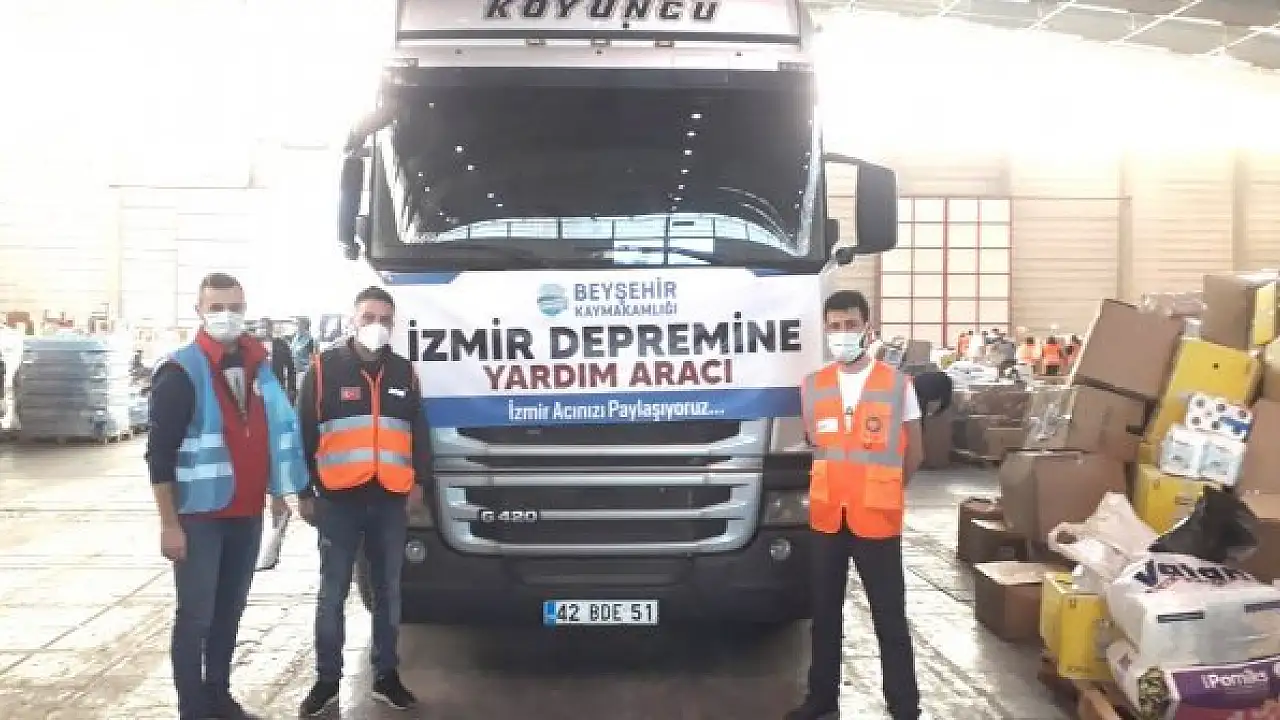 AFAD Başkanlığı'nın Konya Valiliği ile birlikte yürüttüğü yardım kampanyası çerçevesinde, Beyşehir'de, İlçe Kaymakamlığı ve Beyşehir Belediyesi işbirliği ile anıt meydanında kurulan çadırlarda bir süre önce gıda malzemeleri ve battaniye gibi toplanan 1 tır dolusu yardım malzemesi İzmir'e ulaştı.