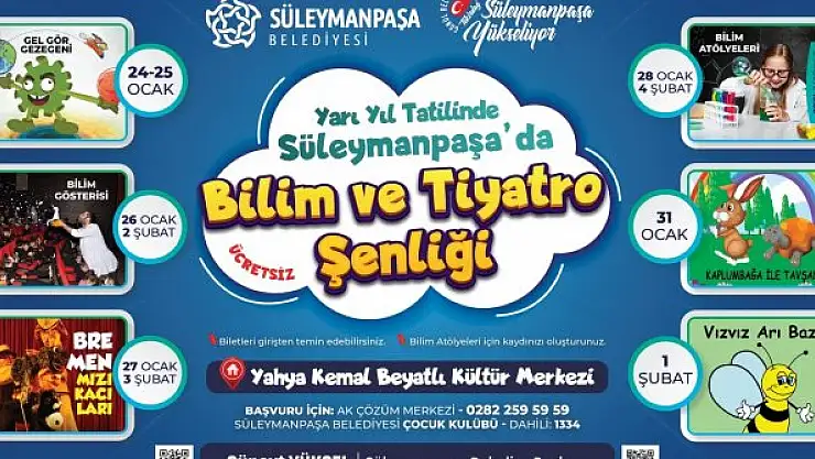 Süleymanpaşa Belediyesi, yarıyıl tatilinde öğrenciler için birbirinden güzel programlar ve etkinlikler hazırladı. Tatil boyunca bilim gösterileri, tiyatrolar ve atölyeler çocukları bekliyor olacak. 24 Ocak'ta başlayacak etkinlikler 4 Şubat'a kadar sürecek.