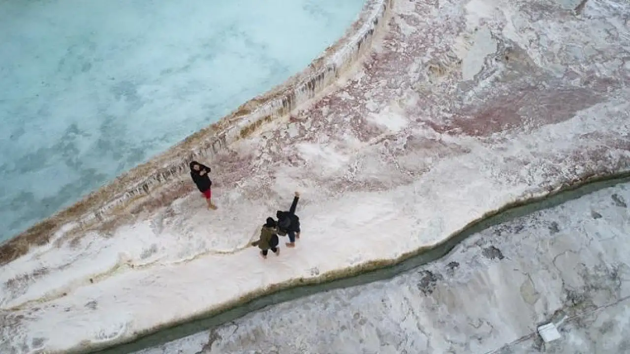 Yer altından çıkan sudaki kalsiyum karbonatın yıllar içinde birikmesiyle oluşan travertenlerin üzerinde çıplak ayakla yürüyenler, soğuk havaya rağmen suyun sıcaklığı sayesinde üşümüyor. Pamukkale'nin eşsiz manzarası da turistlere ömür boyu saklamak isteyecekleri fotoğraflar çekme imkanı sunuyor.