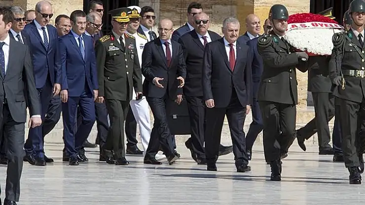 YAŞ heyeti daha sonra üzerinde "YAŞ üyeleri" yazan çelenkle Aslanlı Yol'dan yürüdü. Başbakan Yıldırım'ın, Atatürk'ün mozolesine çelenk bırakmasının ardından, saygı duruşunda bulunuldu. Yıldırım, saygı duruşunun ardından dua etti.