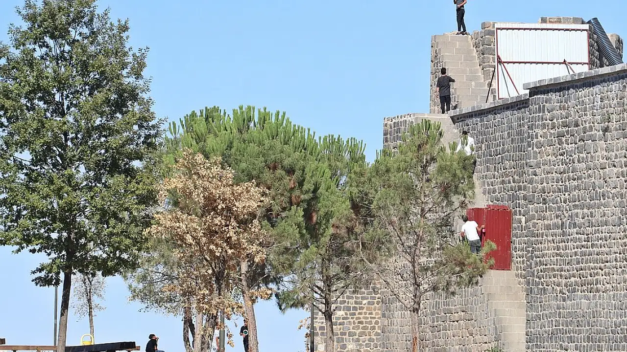 DİYARBAKIR'da yasağa aldırış etmeyen gençler, demir bariyerleri aşarak 12 metreyi bulan tarihi surlara çıkıp, özçekim yapıyor.