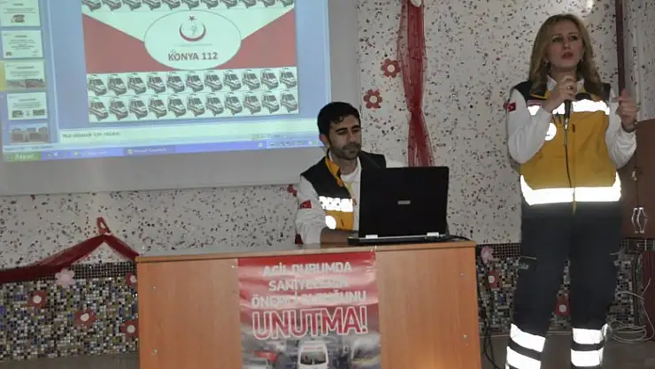 Seydişehir İlçesinde 112 Acil Sağlık Hizmetleri Haftası nedeniyle okullarda 112 istasyonu görevlileri tarafından öğrencilere 'Yaşama Yol Ver' projesi anlatılıyor.