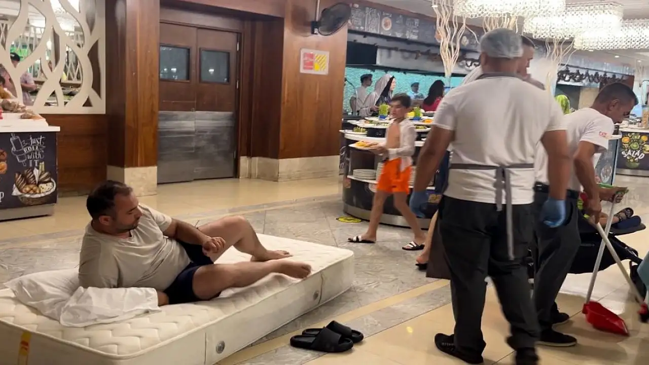 ANTALYA'nın Serik ilçesinde 5 yıldızlı otelde konaklayan Cenk Bilge, arızalanan klimasına çözüm bulunmadığı gerekçesiyle otelin yemekhanesine götürdüğü yatağa uzanıp yattı.