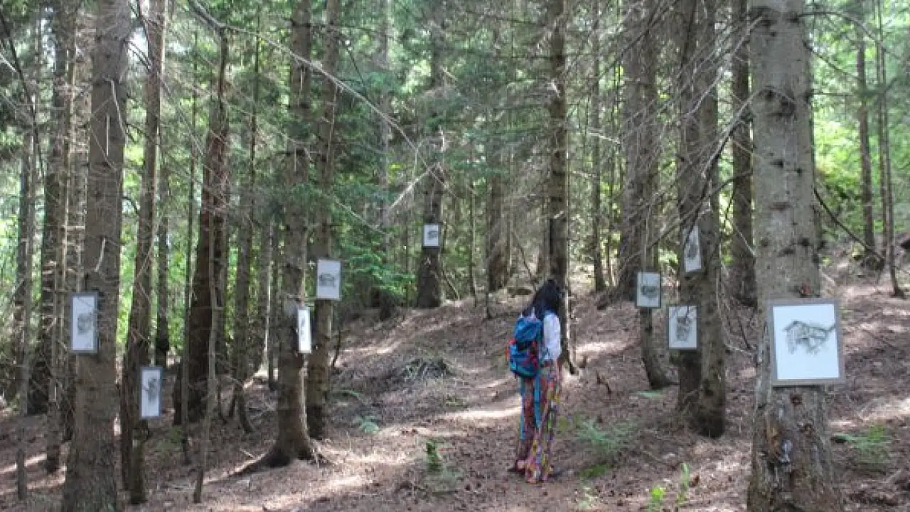 RİZE'nin İkizdere ilçesinde bir lisede Görsel Sanatlar Öğretmeni Çağla Genç (32), ahşap ve taş karışımlı yayla evlerini çizdi. Genç, resimlerini ormanda ağaçlara asarak sergiledi.