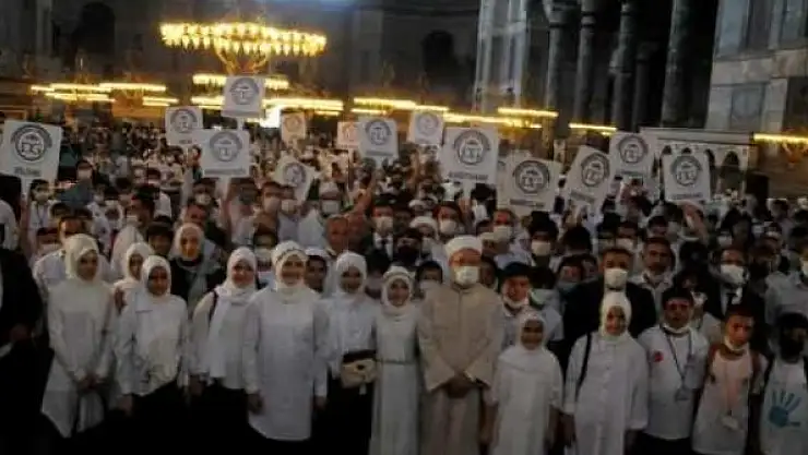 İstanbul İl Müftülüğünün organize ettiği programda, İstanbul’un tüm ilçelerinden gelen yaz Kur’an kursu öğrencileri, Diyanet İşleri Başkanı Erbaş’ın arkasından Ayasofya Camii’ne tekbirler eşliğinde giriş yaptılar.
