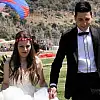 Yeni evli çiftten gelinlik ve damatlıkla yamaç paraşütü