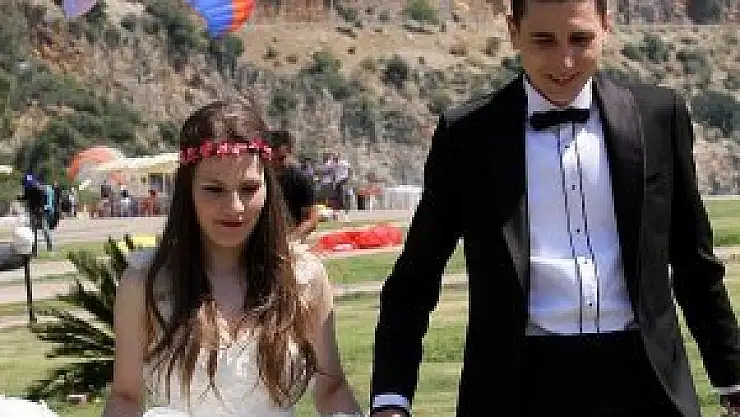 İstanbul'da evlenen Onur ve Dilara Kodal çifti, gelinlik ve damatlıkla Babadağ'dan yamaç paraşütüyle atladı.