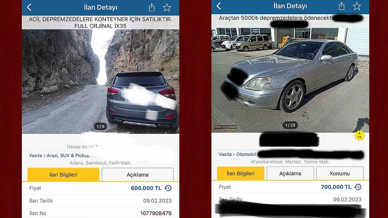 Söz konusu ilanlarda araçların satılması durumunda depremzedelere bağışlanacak tutar 5 bin lira bazılarında ise 30 bin lira olarak belirtiliyor. Bir ilanda ise depremzedelere konteyner alınması vaadiyle satışa konulduğu görüldü.