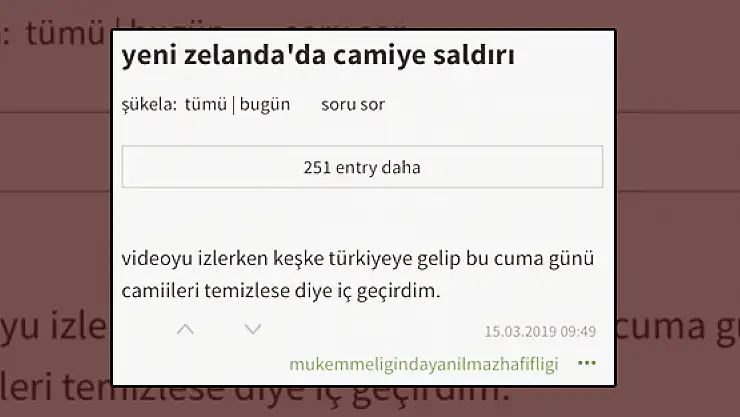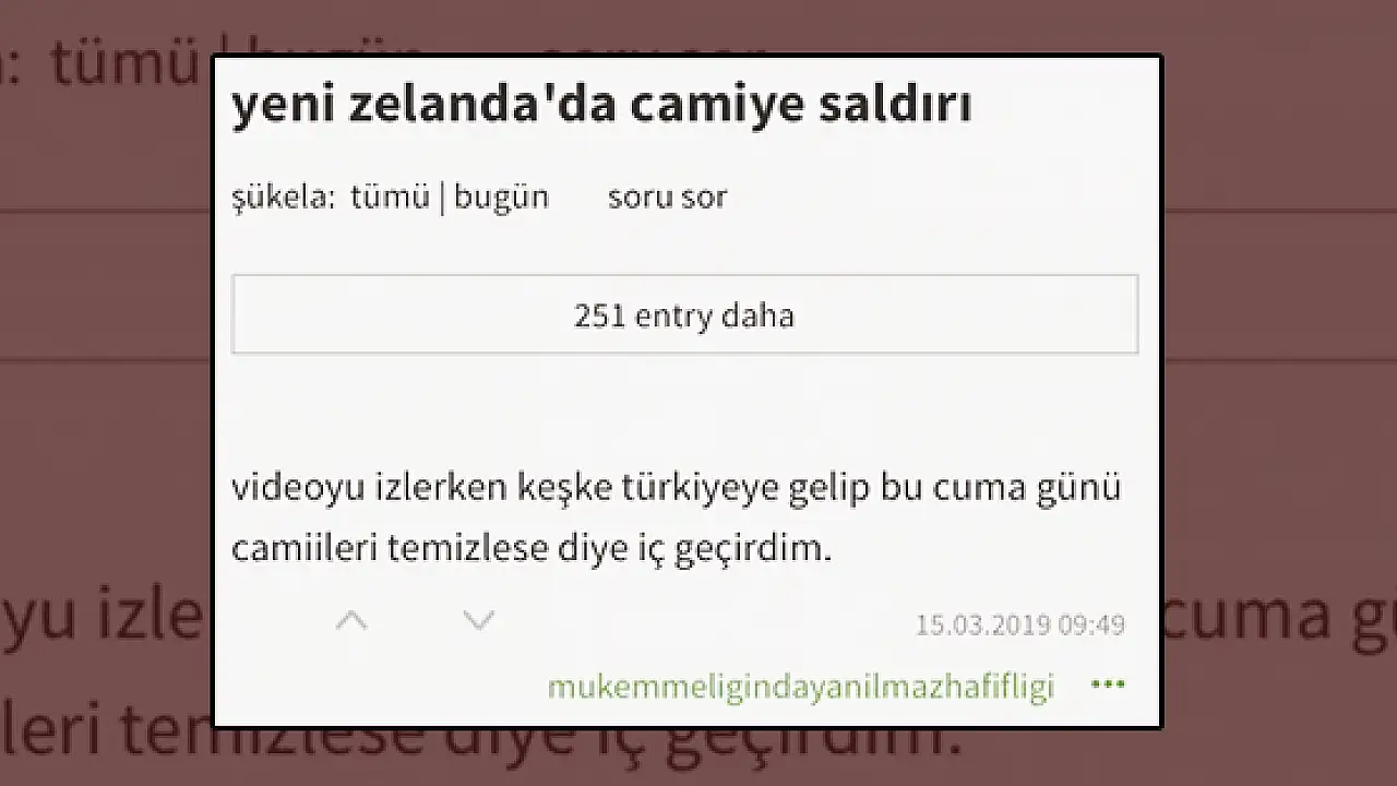 Ekşisözlük sitesinde Yeni Zelanda'nın Christchurch kentindeki 2 ayrı camiye düzenlenen silahlı saldırıyla ilgili alçakça yorumlar yapıldı. Türkiye'deki İslam düşmanları Ekşi Sözlük üzerinden nefret saçtı.