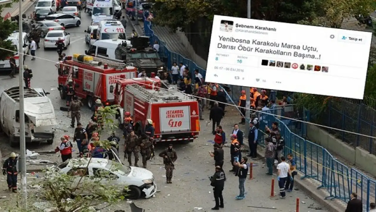 Sosyal paylaşım sitesi Twitter'da Şebnem Karahanlı isimli kullanıcı skandal ifadeler kullandı. Karahanlı, patlamadan sonra yazdığı 'Yenibosna Karakolu Mars'a Uçtu, darısı öbür karakolların başına' mesajıyla terör çığırtkanlığı yaptı.