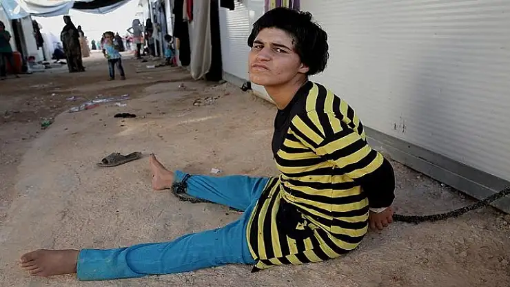 Suriye'de bebekliğinde geçirdiği ateşli hastalığın ardından psikolojik sorunlar yaşayan, 3 yıl önce de bombardımanların neden olduğu travma sonucu etrafına zarar vermeye başlayan Emel Ganim, yetim ve dullar için oluşturulan kampta el ve ayakları bağlı yaşıyor.