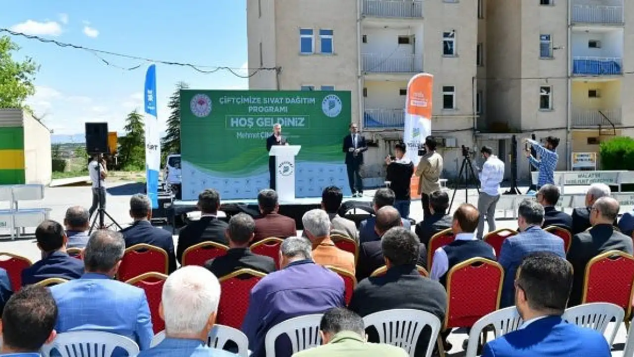 Yeşilyurt Belediyesi Tarımsal Hizmetler Müdürlüğü önünde düzenlenen sıvat dağıtım törenine, Yeşilyurt Belediye Başkanı Mehmet Çınar, İl Tarım ve Orman Müdürü Tahir Macit, Malatya Ziraat Mühendisleri Odası Başkanı Fevzi Çiçek, Malatya Tarım Platformu ile Damızlık Koyun Keçi Yetiştiriciliği Birlik Başkanı İhsan Akın, Yeşilyurt İlçe Tarım Müdürü Süleyman Pektaş, Yeşilyurt Ziraat Odası Başkanı Doğan Solmaz, yetiştiriciler ile çiftçiler katıldı.