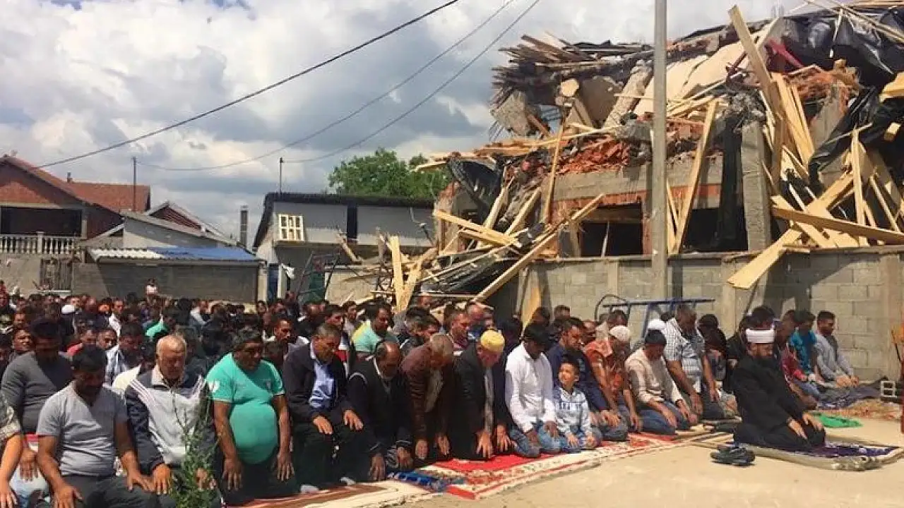 Sırbistan'ın başkenti Belgrad'a bağlı Zemun Polje'de, "inşaat izni olmadığı" gerekçesiyle Sırp makamlarınca bu sabah yıkılan mescidin önünde Cuma namazı kılındı.