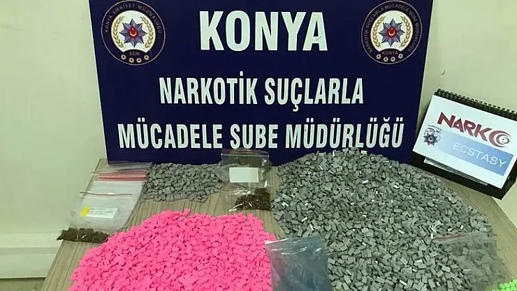 Edinilen bilgiye göre, Konya İl Emniyet Müdürlüğü Narkotik Suçlarla Mücadele Şubesi ekipleri, il merkezi genelinde uyuşturucu tacirliği yapan ve torbacı olarak bilinen kişileri yakalamak için İstihbarat Şube Müdürlüğü ekipleri ile birlikte yürüttüğü çalışmada İstanbul ilinden Konya kent merkezine yüklü miktarda uyuşturucu madde sevkıyatı yapacağı bilgisine ulaştı. Ekipler, Ş.E'nin D.S. ile birlikte sürekli olarak kuryelik yaptırdığını tespit etti. Düzenlenen operasyonla her iki şüphelinin evlerinde ve araçlarında yapılan aramalar sonucunda toplam 6 bin 812 adet ecstasy hap ve 29 gram skunk maddesi ele geçirildi. Gözaltına alınan şahısların emniyetteki ifadelerinin ardından adliyeye sevk edileceği öğrenildi.