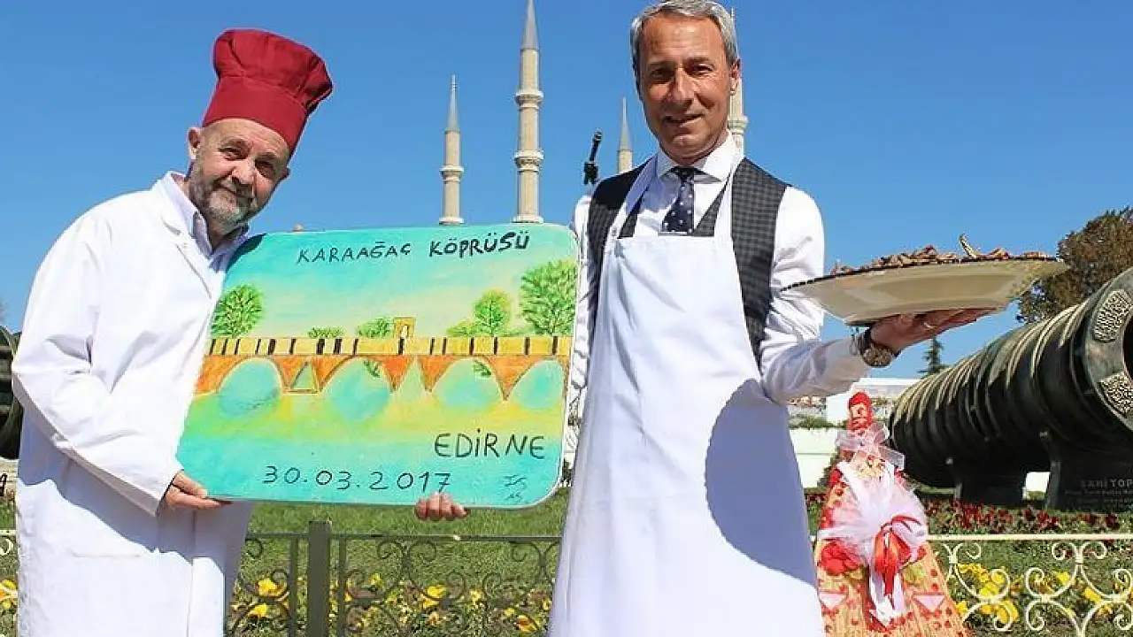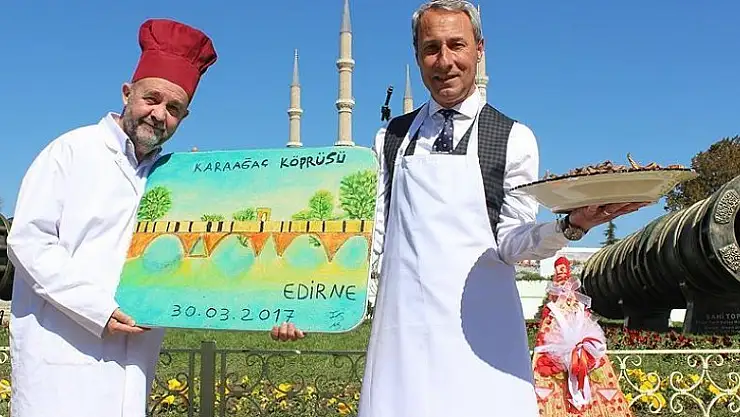 "Yarın bizim için çok önemli bir gün. Başbakanımız Yıldırım Edirne’ye gelecek. Tabi temelini atmış olduğu Karaağaç Köprüsü’nün de açılışını yapacak. Biz de bugünün anısına Başbakanımıza bir hediye sunmak istedik. Arif ustayla birlikte 'ne yapabiliriz?' diye düşündük. Onlar bize çok önemli bir köprü armağan ediyorlar. Biz de onlara tatlıdan bir köprü sunmak istedik. Yarın Başbakanımıza badem ezmesinden yapılmış köprü motifli hediyemizi vereceğiz. Başbakanımızın değerli eşine de Edirne’nin meşhur aynalı süpürgesini hediye edeceğiz. Aynı zamanda ünü dünyayı aşan tava ciğerimizi de kendilerine sunacağız.