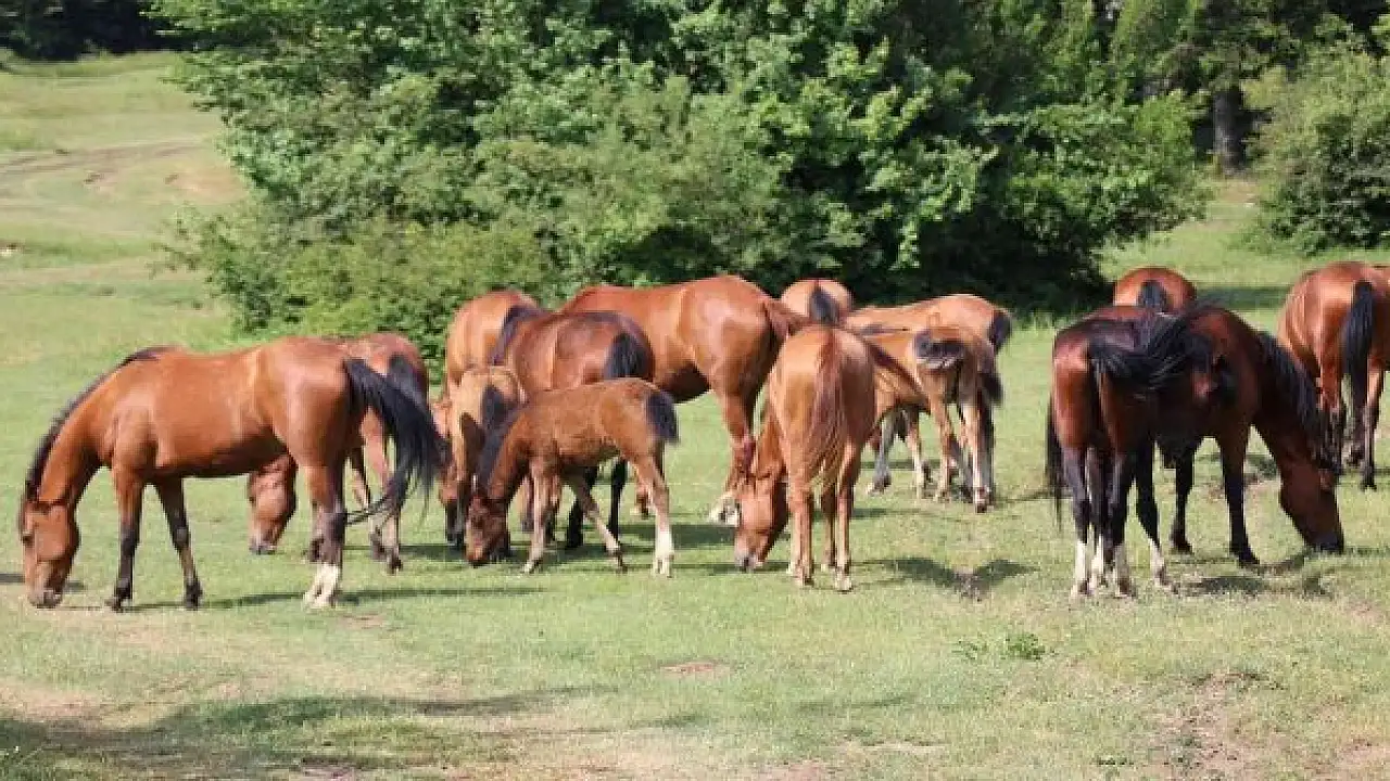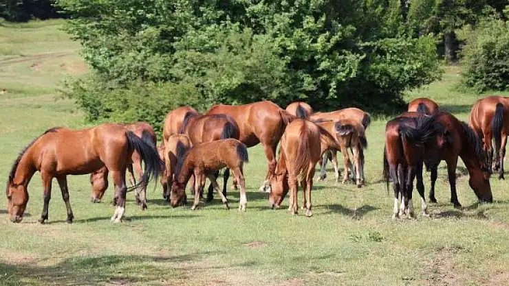 Bolu'da, havaların ısınmasıyla sürüler halinde otlayan Yılkı Atları yavrularıyla birlikte doğal ortamlarında görüntülendi.