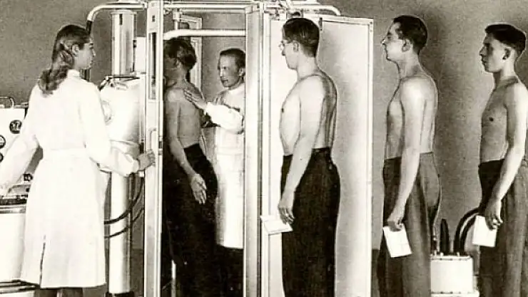 Dispansere gidersiniz, iterler çekerler Cemil Topuzlu Paşa’dan kalma bir aletin karşısına. Röntgen tüpü mafsallıdır; kafa oynar, getirir obüs namlusu gibi sinenize dayarlar.