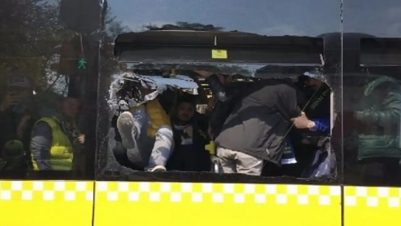 Taraftarlar tezühüratlarıyla takımlarına destek olurken, bir otobüsün camının kırıldığı görüldü. Taraftarlar otobüsün camını kırdıktan sonra, çerçevenin kenarında kalan cam parçacıklarını da ayaklarıyla temizleyerek dışarıya döktüler.