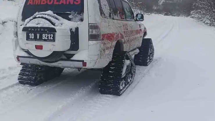Balıkesir'de yoğun kar yağışı nedeniyle kırsal mahallelerde yaşanan sağlık sorunlarına İl Sağlık Müdürlüğü'ne bağlı 112 Acil Sağlık Ekipleri paletli ambulansla çare oluyor.