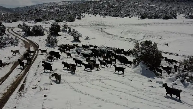 Konya'nın Beyşehir ilçesinde, kar yağışının durmasının ardından dağlık alanlarda yayılıma çıkan keçi sürüleri, çobanlar tarafından zor şartlarda besleniyor.
