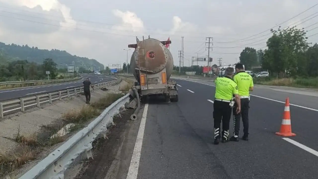 Düzce'de, D-100 karayolu Bolu Dağı mevkiinde yokuş aşağı inen tankerin freni patladı. Polis ekiplerinin önlem aldığı yolda sürücü, tankeri bariyerlere sürterek durdurdu.