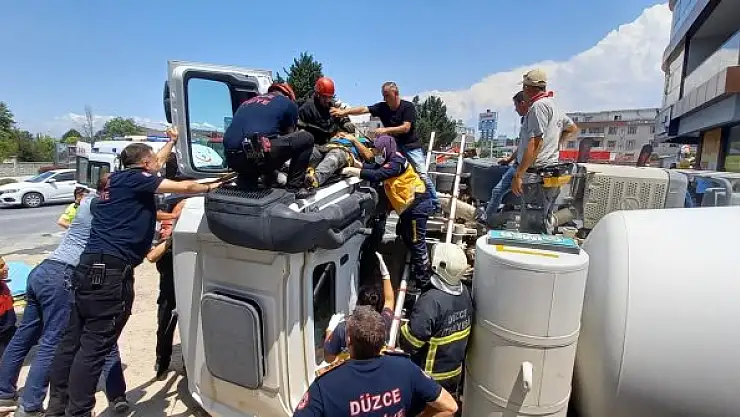 DÜZCE'de, beton mikseri yolun çökmesi sonucu devrildi. Mikserin şoförü Seyfullah Terzi yaralandı.