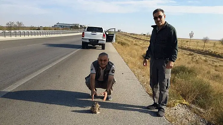 Konya'da yola çıkan puhu kuşunu araçlar tarafından ezilmekten milli parklar görevlileri kurtardı.
