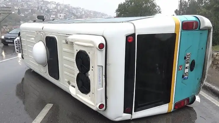 İzmir'in Konak ilçesinde yağmur nedeniyle kayganlaşan yolda bir yolcu minibüsü devrildi. Kazada yaralanan sürücü hastaneye kaldırıldı.