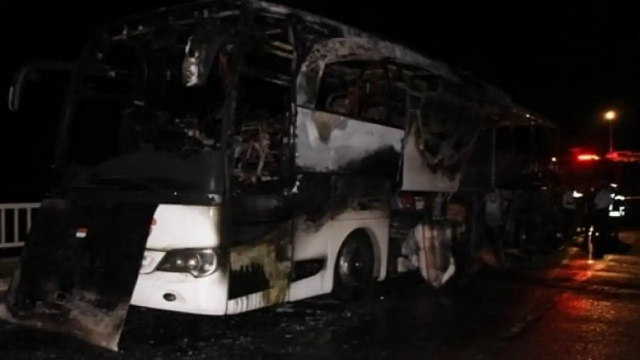 Amasya'da hareket halindeyken alev alan yolcu otobüsü tamamen yandı. Yolcuların alevlerin yükselmeden tahliye edilmesiyle muhtemel bir facia önlendi.
