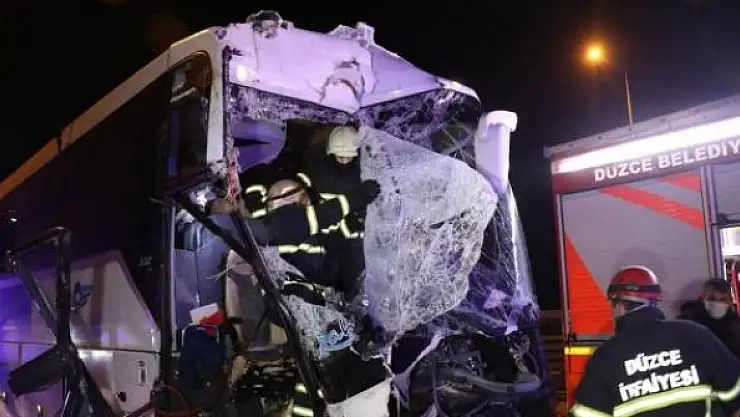 Anadolu Otoyolu Düzce kesiminde, yolcu otobüsünün kamyona çarpması sonucu 16 kişi yaralandı.