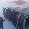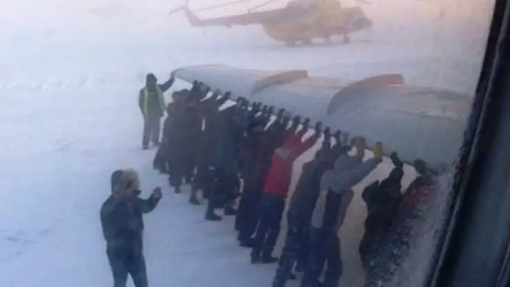 Rusya'da İgarka Havalimanınında eksi 50 derece soğuktan dolayı tekerleri donan uçağı, yolcular iterek hareket ettirdi.