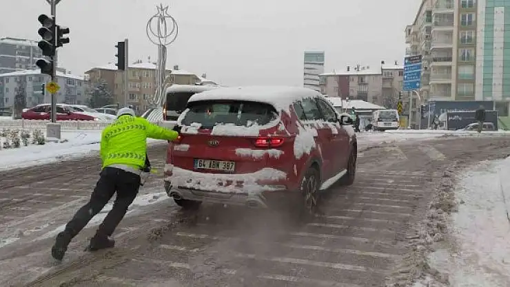 Uşak'ta etkili olan kar yağışının ardından trafikte zor anlar yaşayan sürücülerin imdadına trafik polisleri yetişti.