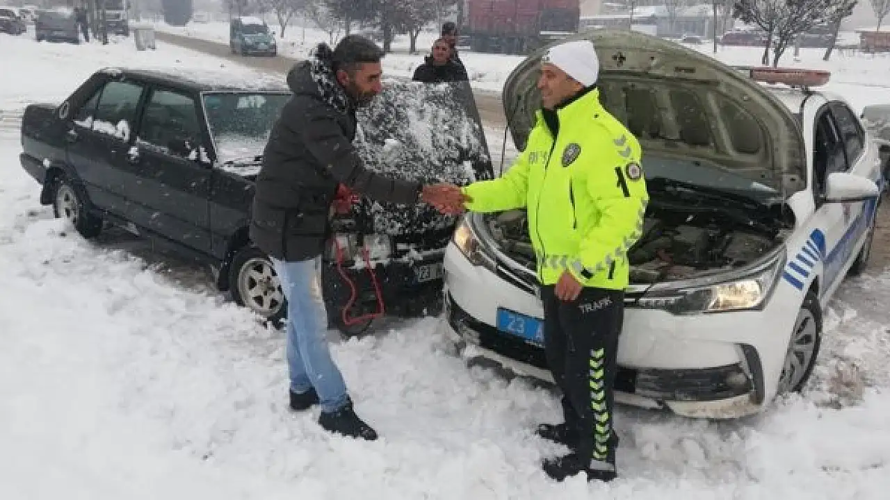 Elazığ'da yoğun kar yağışı sonrasında yollarda kalan sürücülerin imdadına polis ekipleri yetişti.