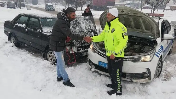 Elazığ'da, Meteoroloji 13. Bölge Müdürlüğü'nün uyarısının ardından kar yağışı geçen haftadan beri etkisini sürdürüyor. Bazı sürücüler karlı kaplı zeminde ilerlemekte zorlanınca yardımlarına polis koştu. Kiminin aracını yiten polis ekipleri, kimini ise saplandığı kardan kurtardı. Sürülerin zincir takmasına ve araçlarının boşalan akülerini doldurmasına yardımcı olan polis ekipleri, her kesim tarafından taktir topladı.