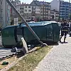 Kastamonu'da Taşköprü kavşağında sürücüsünün direksiyon hakimiyetini kaybettiği otomobil, aydınlatma direğini devirdikten sonra otoparkın çatısına uçtu.